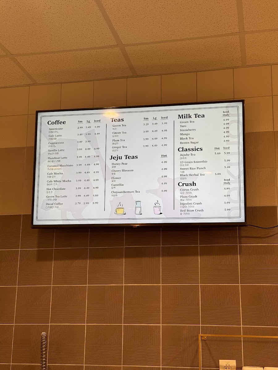 The menu at Nakwon Rice Cake/ Sweet Rice/ Peachtree offers a selection of traditional Korean rice cakes alongside a variety of beverages including coffee and tea. The focus is on rice cakes made fresh and available in multiple vegan options, with most items being egg-free and minimal dairy usage. Customers can choose from both hot and iced tea and coffee drinks to accompany their food selections.